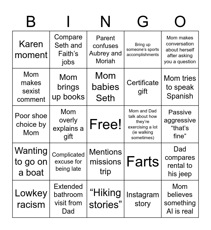 This bingo card has a free space and 29 words: Lowkey racism, Mom cries, Mom overly explains a gift, Seth complains about food, Karen moment, Parent confuses Aubrey and Moriah, Mom brings up books, Complicated excuse for being late, Mom and Dad talk about how they’re exercising a lot (ie walking sometimes), Extended bathroom visit from Dad, Passive aggressive “that’s fine”, Mom believes something AI is real, “Hiking stories”, Instagram story, Mom tries to speak Spanish, Make something overly spiritual, Mentions missions trip, Wanting to go on a boat, Mom makes conversation about herself after asking you a question, Poor shoe choice by Mom, Farts, Seth mentions being annoyed by his students, Certificate gift, Mom makes sexist comment, Bring up someone’s sports accomplishments, Compare Seth and Faith’s jobs, Dad compares rental to his jeep, Mom babies Seth and Mom and Dad need to finish Christmas shopping after they arrive.