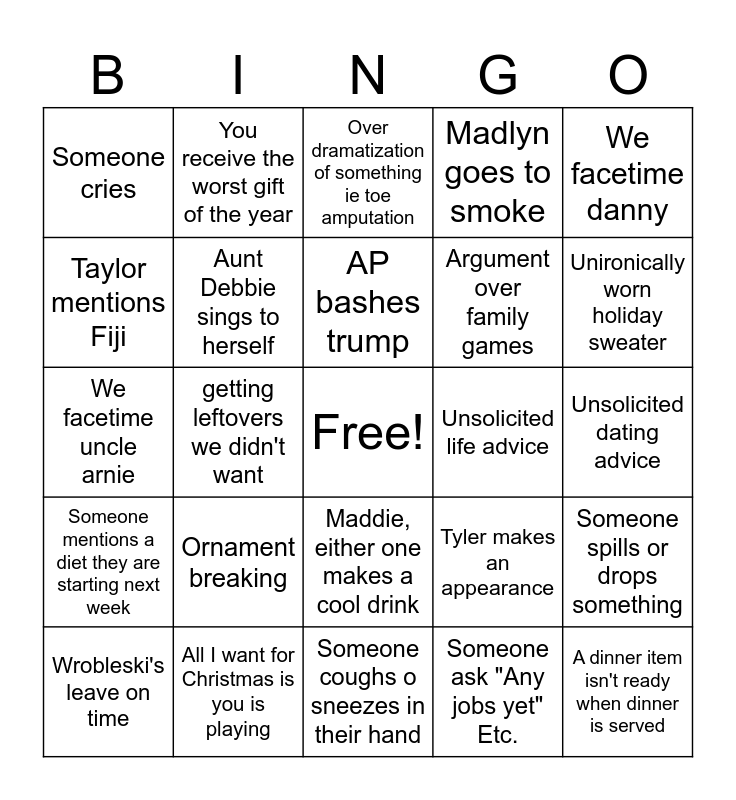 This bingo card has a free space and 35 words: Alejandro curses infront of gma, Uncle Joey is on the couch, Gma mentions her dad, Aunt Debbie sings to herself, Maddie, either one makes a cool drink, Madlyn goes to smoke, Taylor mentions Fiji, Marc gets brought up, AP bashes trump, Taylor is visibly drunk, We facetime uncle arnie, We facetime danny, Uncle joey goes to the hospital, Either grandpa is mentioned, Someone cries, Unsolicited life advice, Someone ask "Any jobs yet" Etc., getting leftovers we didn't want, Someone mentions a diet they are starting next week, A dinner item isn't ready when dinner is served, Tyler makes an appearance, Wrobleski's leave on time, Someone spills or drops something, All I want for Christmas is you is playing, Over dramatization of something ie toe amputation, Unironically worn holiday sweater, Dave has a peanut scare, Someone falls, Argument over family games, Unsolicited dating advice, wild conspiracy theory is talked about, Someone coughs o sneezes in their hand, Ornament breaking, You receive the worst gift of the year and Someone opens the wrong present.