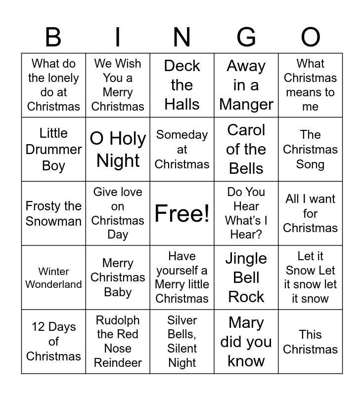 This bingo card has a free space and 27 words: Jingle Bell Rock, O Christmas Tree, Carol of the Bells, Silver Bells, Silent Night, Little Drummer Boy, Deck the Halls, We Wish You a Merry Christmas, Winter Wonderland, Do You Hear What’s I Hear?, Let it Snow Let it snow let it snow, Frosty the Snowman, Away in a Manger, 12 Days of Christmas, Rudolph the Red Nose Reindeer, The Christmas Song, Go Tell it on the Mountain, O Holy Night, Someday at Christmas, Merry Christmas Baby, What do the lonely do at Christmas, All I want for Christmas, Mary did you know, Give love on Christmas Day, This Christmas, Have yourself a Merry little Christmas, What Christmas means to me and Santa Baby..