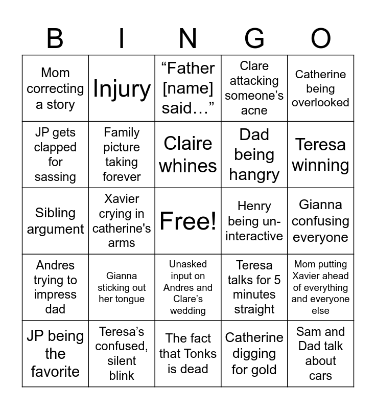 This bingo card has a free space and 24 words: Gianna sticking out her tongue, Teresa’s confused, silent blink, Claire whines, JP being the favorite, Catherine being overlooked, Mom correcting a story, JP gets clapped for sassing, Injury, Henry being un-interactive, Unasked input on Andres and Clare’s wedding, Dad being hangry, Sibling argument, Teresa talks for 5 minutes straight, Mom putting Xavier ahead of everything and everyone else, Family picture taking forever, Catherine digging for gold, Gianna confusing everyone, “Father [name] said…”, Teresa winning, Xavier crying in catherine's arms, Sam and Dad talk about cars, Andres trying to impress dad, Clare attacking someone’s acne and The fact that Tonks is dead.