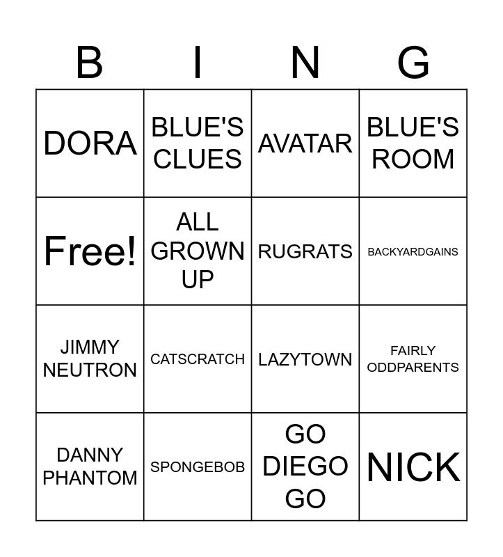 This bingo card has 16 words: SPONGEBOB, FAIRLY ODDPARENTS, AVATAR, DORA, JIMMY NEUTRON, BLUE'S CLUES, LAZYTOWN, GO DIEGO GO, Free!, ALL GROWN UP, DANNY PHANTOM, BLUE'S ROOM, CATSCRATCH, BACKYARDGAINS, RUGRATS and NICK.