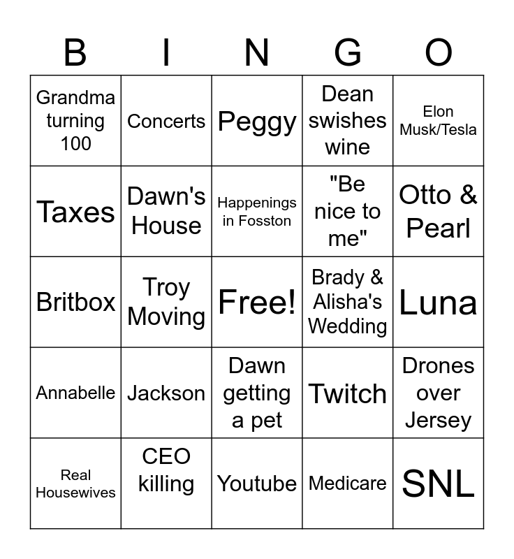This bingo card has a free space and 29 words: Real Housewives, Gravesite, Troy Moving, Vikings, Grandma turning 100, Peggy, Dawn's House, Jackson, Brady & Alisha's Wedding, CEO killing, Luna, SNL, Youtube, Medicare, Otto & Pearl, Wicked, Dawn getting a pet, Annabelle, Elon Musk/Tesla, Britbox, Twitch, Trump, "Be nice to me", Taxes, Dean swishes wine, Concerts, Drones over Jersey, Happenings in Fosston and Matt Gaetz.
