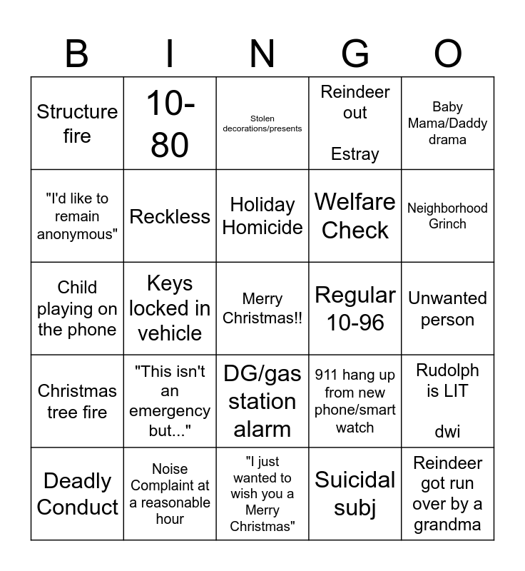 This bingo card has a free space and 24 words: "This isn't an emergency but...", Noise Complaint at a reasonable hour, Holiday Homicide, Deadly Conduct, Baby Mama/Daddy drama, Structure fire, "I'd like to remain anonymous", 10-80, Regular 10-96, DG/gas station alarm, Welfare Check, Child playing on the phone, 911 hang up from new phone/smart watch, Rudolph is LIT dwi, Reckless, Suicidal subj, Unwanted person, Stolen decorations/presents, Neighborhood Grinch, Keys locked in vehicle, Reindeer got run over by a grandma, Christmas tree fire, Reindeer out Estray and "I just wanted to wish you a Merry Christmas".