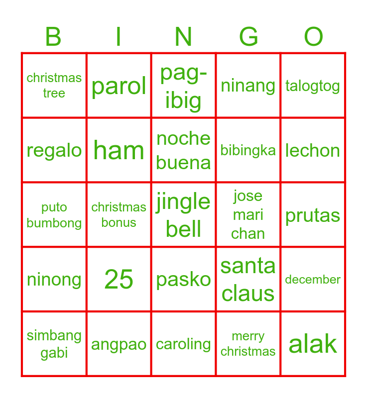 This bingo card has 25 words: 25, caroling, noche buena, simbang gabi, talogtog, christmas tree, regalo, parol, jose mari chan, pasko, bibingka, puto bumbong, santa claus, december, ham, alak, prutas, pag-ibig, lechon, christmas bonus, jingle bell, angpao, ninong, ninang and merry christmas.