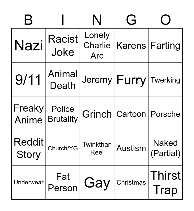 This bingo card has a free space and 24 words: Church/YG, Fat Person, Jeremy, Underwear, Farting, Nazi, 9/11, Racist Joke, Cartoon, Twinkthan Reel, Furry, Freaky Anime, Austism, Naked (Partial), Animal Death, Christmas, Porsche, Lonely Charlie Arc, Twerking, Police Brutality, Thirst Trap, Reddit Story, Karens and Gay.