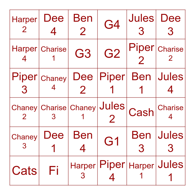 This bingo card has 36 words: G1, Ben 4, Piper 4, Harper 4, Chaney 2, Piper 1, Charise 1, Harper 3, Jules 3, Ben 3, Charise 2, G4, Jules 3, Chaney 4, G2, Harper 2, Chaney 3, Ben 1, Piper 3, Ben 2, Dee 2, Charise 3, Jules 2, Chaney 1, Cash, Dee 4, Piper 2, Fi, G3, Dee 3, Jules 1, Cats, Charise 4, Jules 4, Dee 1 and Harper 1.