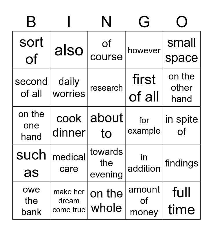 This bingo card has a free space and 29 words: owe the bank, after all, cook dinner, serious health issues, sort of, of course, daily worries, medical care, for example, make her dream come true, in spite of, full time, on the whole, amount of money, on the other hand, travel around, towards the evening, such as, small space, on the one hand, in addition, to sum up, first of all, second of all, however, also, findings, research and expert.