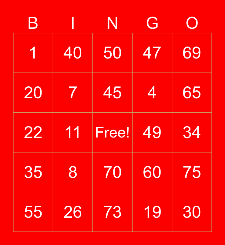 This bingo card has a free space and 24 words: 8, 26, 45, 55, 69, 1, 20, 40, 49, 70, 4, 22, 60, 75, 7, 19, 34, 50, 65, 11, 30, 35, 47 and 73.