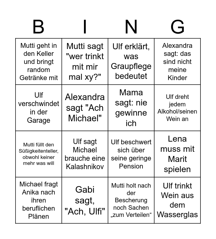 This bingo card has 16 words: Gabi sagt, "Ach, Ulfi", Lena muss mit Marit spielen, Ulf erklärt, was Graupflege bedeutet, Mutti geht in den Keller und bringt random Getränke mit, Mutti füllt den Süßigkeitenteller, obwohl keiner mehr was will, Mutti sagt "wer trinkt mit mir mal xy?", Ulf beschwert sich über seine geringe Pension, Mutti holt nach der Bescherung noch Sachen „zum Verteilen“, Ulf verschwindet in der Garage, Alexandra sagt "Ach Michael", Michael fragt Anika nach ihren beruflichen Plänen, Alexandra sagt: das sind nicht meine Kinder, Ulf sagt Michael brauche eine Kalashnikov, Ulf dreht jedem Alkohol/seinen Wein an, Mama sagt: nie gewinne ich and Ulf trinkt Wein aus dem Wasserglas.