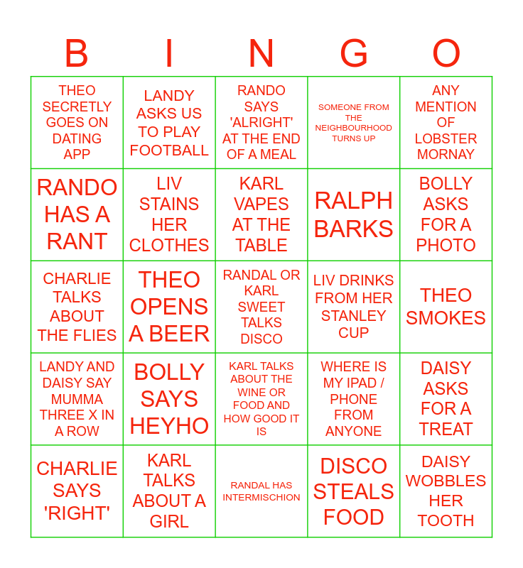 This bingo card has a free space and 24 words: BOLLY SAYS HEYHO, KARL TALKS ABOUT A GIRL, KARL VAPES AT THE TABLE, CHARLIE SAYS 'RIGHT', ANY MENTION OF LOBSTER MORNAY, THEO SECRETLY GOES ON DATING APP, RANDO HAS A RANT, LANDY ASKS US TO PLAY FOOTBALL, LIV DRINKS FROM HER STANLEY CUP, KARL TALKS ABOUT THE WINE OR FOOD AND HOW GOOD IT IS, RALPH BARKS, CHARLIE TALKS ABOUT THE FLIES, WHERE IS MY IPAD / PHONE FROM ANYONE, DAISY ASKS FOR A TREAT, LIV STAINS HER CLOTHES, DISCO STEALS FOOD, THEO SMOKES, RANDO SAYS 'ALRIGHT' AT THE END OF A MEAL, BOLLY ASKS FOR A PHOTO, THEO OPENS A BEER, DAISY WOBBLES HER TOOTH, LANDY AND DAISY SAY MUMMA THREE X IN A ROW, SOMEONE FROM THE NEIGHBOURHOOD TURNS UP and RANDAL HAS INTERMISCHION.