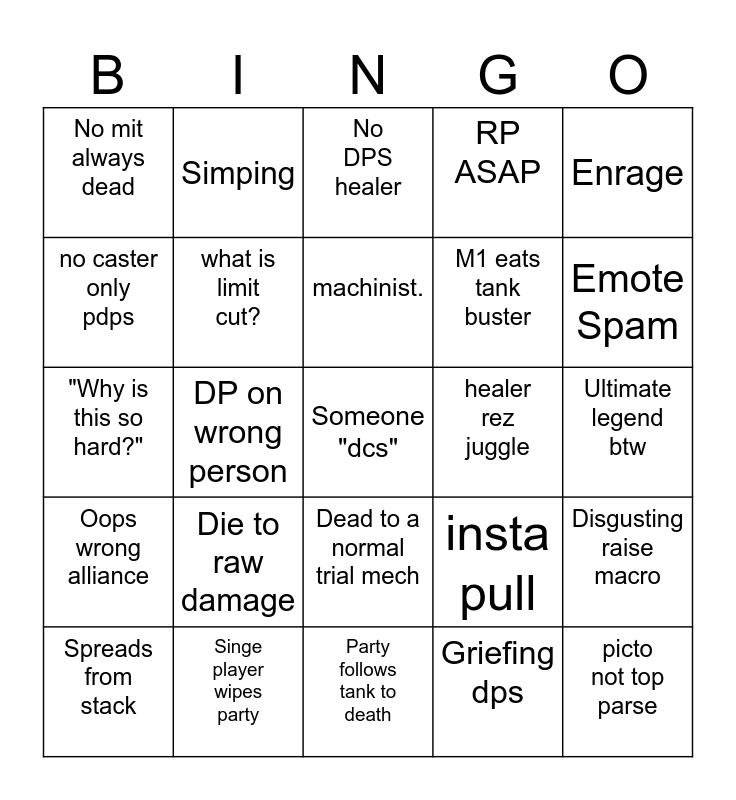 This bingo card has a free space and 25 words: Die to raw damage, Party follows tank to death, machinist., Spreads from stack, Enrage, No mit always dead, no caster only pdps, Simping, healer rez juggle, Dead to a normal trial mech, M1 eats tank buster, "Why is this so hard?", insta pull, Disgusting raise macro, what is limit cut?, dressed as a scion, Ultimate legend btw, No DPS healer, Emote Spam, DP on wrong person, picto not top parse, Singe player wipes party, Oops wrong alliance, RP ASAP and Griefing dps.