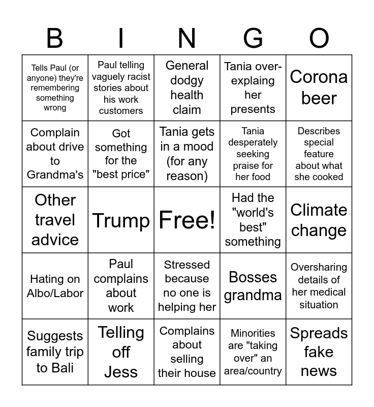 This bingo card has a free space and 30 words: Telling off Jess, Bali advice, Trump, Tells you about your area of expertise, Tells Paul (or anyone) they're remembering something wrong, General dodgy health claim, Got something for the "best price", Stressed because no one is helping her, Had the "world's best" something, Complains about selling their house, Climate change, Spreads fake news, Minorities are "taking over" an area/country, Recommends TV show/movie, Describes special feature about what she cooked, China, Bosses grandma, Hating on Albo/Labor, Paul complains about work, Corona beer, Other travel advice, Massive exaggeration, Paul telling vaguely racist stories about his work customers, Tania desperately seeking praise for her food, Complain about drive to Grandma's, Tania over-explaing her presents, Oversharing details of her medical situation, Suggests family trip to Bali, Tania gets in a mood (for any reason) and Tania contradicts anyone.