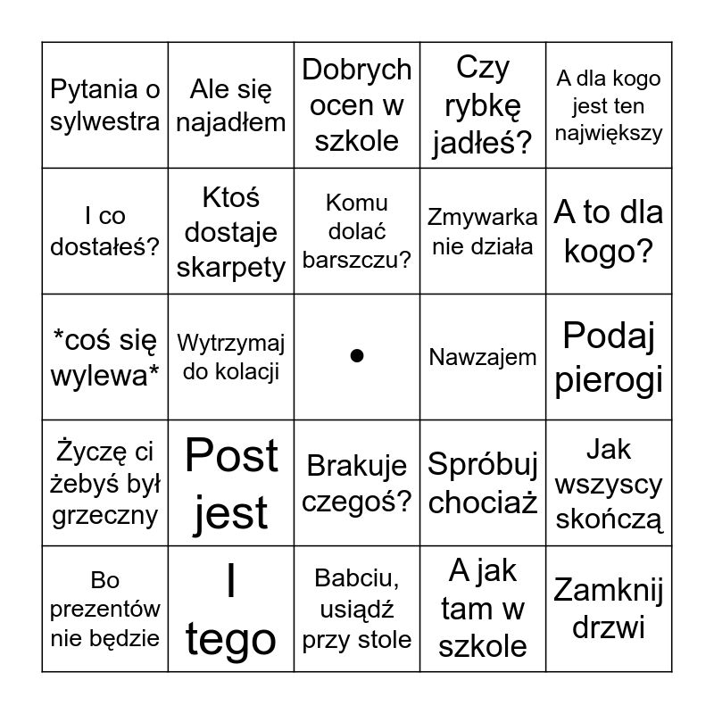 This bingo card has a free space and 24 words: Post jest, I tego, Komu dolać barszczu?, Bo prezentów nie będzie, A dla kogo jest ten największy, Pytania o sylwestra, I co dostałeś?, Ale się najadłem, Nawzajem, Brakuje czegoś?, Zmywarka nie działa, *coś się wylewa*, Spróbuj chociaż, Jak wszyscy skończą, Ktoś dostaje skarpety, A jak tam w szkole, Podaj pierogi, Dobrych ocen w szkole, A to dla kogo?, Wytrzymaj do kolacji, Zamknij drzwi, Życzę ci żebyś był grzeczny, Czy rybkę jadłeś? and Babciu, usiądź przy stole.