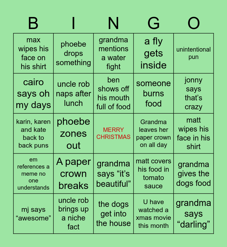 This bingo card has a free space and 24 words: A paper crown breaks, uncle rob brings up a niche fact, ben shows off his mouth full of food, mj says “awesome”, unintentional pun, max wipes his face on his shirt, cairo says oh my days, phoebe drops something, Grandma leaves her paper crown on all day, grandma says “it’s beautiful”, someone burns food, karin, karen and kate back to back puns, matt covers his food in tomato sauce, grandma gives the dogs food, uncle rob naps after lunch, U have watched a xmas movie this month, matt wipes his face in his shirt, grandma mentions a water fight, jonny says that’s crazy, phoebe zones out, grandma says “darling”, em references a meme no one understands, a fly gets inside and the dogs get into the house.