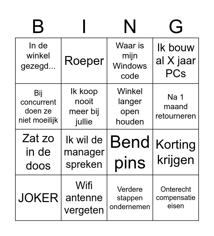 This bingo card has 16 words: Wifi antenne vergeten, Korting krijgen, Waar is mijn Windows code, In de winkel gezegd..., Zat zo in de doos, Roeper, Bend pins, Verdere stappen ondernemen, Bij concurrent doen ze niet moeilijk, Ik koop nooit meer bij jullie, JOKER, Ik bouw al X jaar PCs, Ik wil de manager spreken, Na 1 maand retourneren, Winkel langer open houden and Onterecht compensatie eisen.