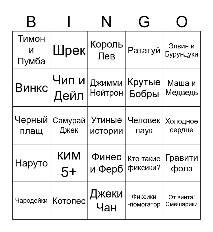 This bingo card has 25 words: ким 5+, Джеки Чан, Джимми Нейтрон, Чародейки, Элвин и Бурундуки, Тимон и Пумба, Винкс, Шрек, Человек паук, Финес и Ферб, Крутые Бобры, Черный плащ, Кто такие фиксики?, Гравити фолз, Чип и Дейл, От винта! Смешарики, Холодное сердце, Король Лев, Маша и Медведь, Самурай Джек, Утиные истории, Котопес, Наруто, Рататуй and Фиксики -помогатор.