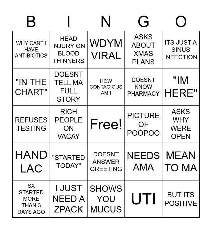 This bingo card has a free space and 24 words: "STARTED TODAY", I JUST NEED A ZPACK, HOW CONTAGIOUS AM I, SX STARTED MORE THAN 3 DAYS AGO, ITS JUST A SINUS INFECTION, WHY CANT I HAVE ANTIBIOTICS, "IN THE CHART", HEAD INJURY ON BLOOD THINNERS, PICTURE OF POOPOO, DOESNT ANSWER GREETING, DOESNT KNOW PHARMACY, REFUSES TESTING, NEEDS AMA, MEAN TO MA, DOESNT TELL MA FULL STORY, UTI, ASKS WHY WERE OPEN, WDYM VIRAL, "IM HERE", RICH PEOPLE ON VACAY, BUT ITS POSITIVE, HAND LAC, ASKS ABOUT XMAS PLANS and SHOWS YOU MUCUS.