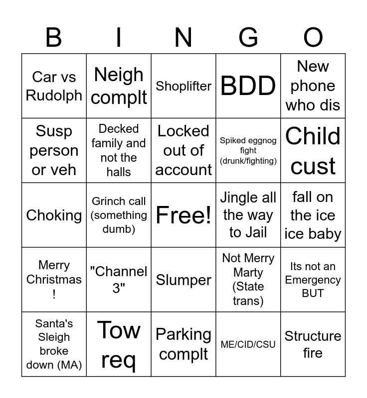 This bingo card has a free space and 29 words: Santa's Sleigh broke down (MA), Alarm call, Grinch call (something dumb), Reckless Sleigh (traff complt), Car vs Rudolph, Shoplifter, Decked family and not the halls, "Channel 3", Jingle all the way to Jail, Tow req, fall on the ice ice baby, Structure fire, Parking complt, ME/CID/CSU, Child cust, VLO, Slumper, Merry Christmas !, New phone who dis, Choking, Not Merry Marty (State trans), Oven fire, Spiked eggnog fight (drunk/fighting), Susp person or veh, BDD, Neigh complt, Its not an Emergency BUT, Locked out of account and ExPat.
