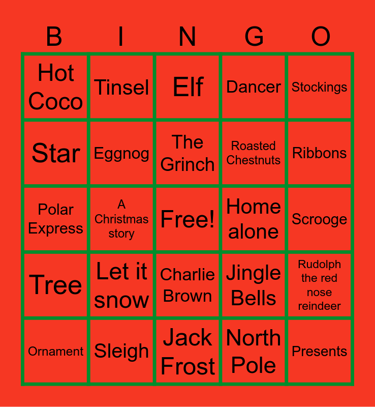 This bingo card has a free space and 29 words: Prancer, Sleigh, Elf, Frosty the Snowman, Stockings, Hot Coco, Eggnog, The Grinch, Home alone, Rudolph the red nose reindeer, Ornament, A Christmas story, North Pole, Presents, Polar Express, Gingerbread, Jack Frost, Jingle Bells, Ribbons, Tree, Let it snow, Lights, Roasted Chestnuts, Scrooge, Star, Tinsel, Charlie Brown, Dancer and Deck the halls.