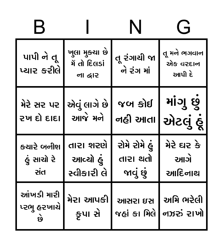 This bingo card has 51 words: Free!, આંખડી મારી પ્રભુ હરખાયે છે, જેની કિકી કાળી છે, કૌન કેહતા હૈ ભગવાન આતે નહીં, આસ ભરીને આવ્યો સ્વામી, ભક્તો પે મહાવીર થોડા ધ્યાન દીજિયે, ખુલા મુક્યા છે મેં તો દિલડાં ના દ્વાર, ભલા કિસી કા કર ના શકો તો, એવું લાગે છે આજે મને, હે પાર્શ્વ્ તુમ્હારે દ્વારે પર, જબ કોઈ નહીં આતા, તૂ મને ભગવાન એક વરદાન આપી દે, જીનો જીનો ઉડે રે ગુલાલ, કભી પ્યાસે કો પાણી પિલાયા નહીં, કર્મો કરેલા મુઝને નડે છે, મૈત્રી ભાવ નું પવિત્ર ઝરણું, માંગુ છું એટલું હૂં, મેરા આપકી કૃપા સે, મારી આંખોં માં સંકેશ્વર, મેરે સર પર રખ દો દાદા, મેરે ઘર કે આગે આદિનાથ, મેરે દોનોં હાથો મેં ઐસી, પાપી ને તૂ પ્યાર કરીલે, ક્યારે બનીશ હું સાચો રે સંત, સમઝુ ને શું કહેવાય, સપના માં સંકેશ્વર પાર્શ્વ દેખાય, તારા શરણે આવ્યો હું સ્વીકારી લે, સંકેશ્વર દાદા મને આસરો તમારો, પ્રભુ તને જોવા ભમું દિન રાત રે, તૂ રંગાયી જા ને રંગ માં, સોના માં સુગંધ ભલે, દુનિયા સે મે હારા, આયા તેરા ભુલાવા આદિનાથ જી, મેરે એક સાથી હૈ, અંતર ના અંતરિક્ષ માં, ચિંતામણી મારી ચિંતા ચૂર, ઢોલીડા ઢોલ ધીમો ધીમો વગાડ માં, હૈ એ પાવન ભૂમિ, તમે મન મૂકીને વરસ્યા, આંખ મારી ઉઘડે તો, આસરા ઇસ જહાં કા મિલે, અમિ ભરેલી નઝરું રાખો, ભક્તિ કરતા છૂટે મારા પ્રાણ, મેરા છોટા સ સંસાર, નામ હૈ તારણ હારા, ઓ પ્રભુ તારા ચરણ, રોમે રોમે હું તારા થતો જાવું છું, ભક્તિ કી હૈ રાત, ભગવાન મેરી નૈયા, આયો પ્રભુ તારે દ્વાર and મેરી ઝોપડી કે ભાગ આજ.