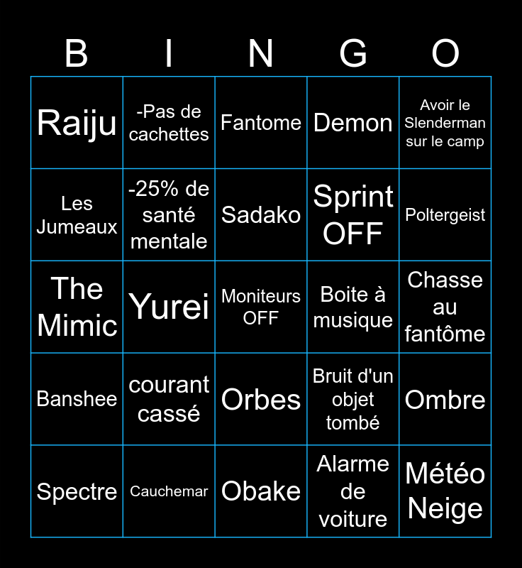This bingo card has 91 words: Apparition du fantôme, Température Glaciales, Orbes, Ecriture fantomatique, Parole dans le spirit box, Cris du Deogen, Microphone parabolique, Spirit Box, Bruits de pas fantomatiques, Cri du fantôme, Porte fermée brusquement, Crucifix brûlé, Coupure de courant, Chasse au fantôme, Objet lancé par le fantôme, Sadako, Apparition Fantomatique, Pouvoir du poltergeist, UV, Dots dans les caméras, Empreintes à 6 Doigts, Goryo, Obake, Yokai, The Mimic, Cauchemar, Oni, Hantu, Onryo, Jinn, Esprit, Ombre, Myling, Banshee, Raiju, Demon, Fantome, Revenant, Yurei, Poltergeist, Spectre, Les Jumeaux, Interférence des appareils électroniques, Le détecteur de mouvement, EMF 5, Bruit d'un objet tombé, Apparition dans la pièce sombre, Trouver l'os en 1er, Un joueur est victime de la malédiction du moroi, Map Aléatoire, Fantôme en 150 de speed, Sprint OFF, Lampres OFF, Sans preuves, Bruit de porte claquée, Poupée Vaudou, Boite à musique, Crucifix usé à 100%, Objets Tier 1 Uniquement., -1 Preuve, Partie effectué en 15 Min, douche allumée, Téléphone sonne, Rire d'enfant, Cri de la banshee, Loop en chasse maudite, Orbes dans la neige, Alarme de voiture, Yurei claque la porte d'entrée, Photo de l'entité, courant cassé, Moniteurs OFF, -2 encens, -1 cachette, -Pas de cachettes, -25% de santé mentale, -50% de santé mentale, 0 De santé mentale, -1sec de période de grace, Pas de période de grace, Météo Neige, Avoir le Slenderman sur le camp, DOTS, Brownstone High School, Prison, Souffle de la bougie (x3), Souffle de la bougie (x2), Ecriture Fantomatiques, Son du Piano, Sunny Meadows and Souffle du briquet.