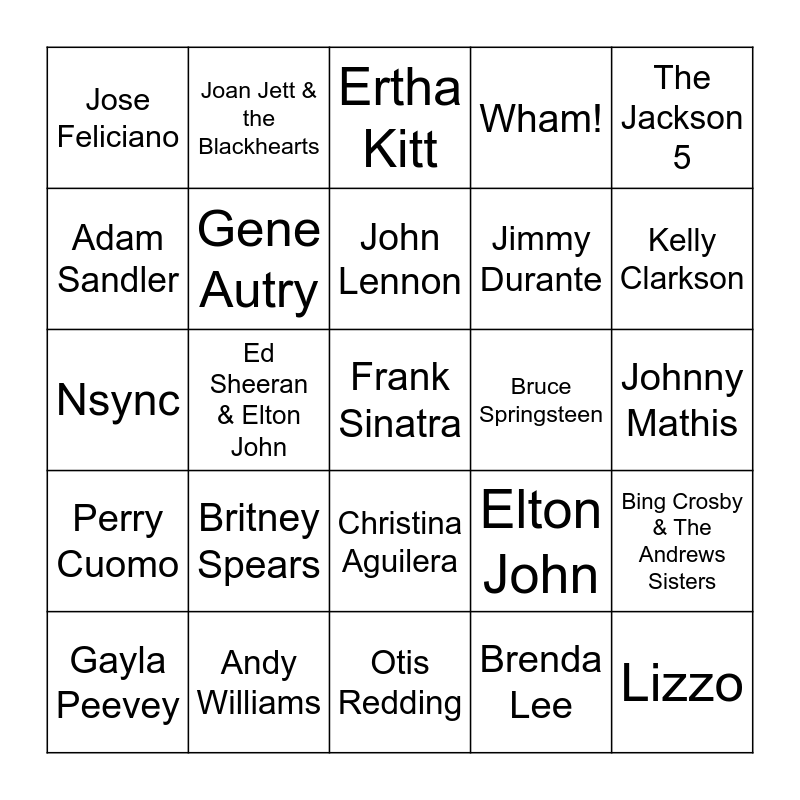This bingo card has 58 words: Bobby Helms, Andy Williams, Burl Ives, Perry Cuomo, Brenda Lee, Chuck Berry, Gene Autry, Dean Martin, Jimmy Durante, Elvis Presley, Wham!, Mariah Carey, The Beach Boys, Nat King Cole, Darlene Love, Jose Feliciano, Frank Sinatra, The Jackson 5, Paul McCartney, John Lennon, Bruce Springsteen, Ertha Kitt, Gayla Peevey, Bing Crosby & The Andrews Sisters, John Legend, Johnny Mathis, Jonas Brothers, Katy Perry, Kelly Clarkson, Lou Monte, The Carpenters, The Waitresses, Run-DMC, Sia, Justin Bieber, Jimmy Fallon & Meghan Trainor, Ava Max, Ed Sheeran & Elton John, Nsync, Taylor Swift, Britney Spears, Lizzo, Elton John, Ramones, TLC, Blake Shelton, Hall & Oates, Christina Aguilera, Otis Redding, Lee Ann Womack, Dolly Parton, Brad Paisley, Thomas Rhett, Tom Petty, Joan Jett & the Blackhearts, Band Aid, Adam Sandler and Kathryn Jones.