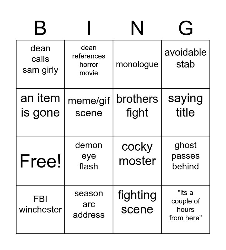 This bingo card has 20 words: ghost passes behind, blood splatter, monologue, winchester lies, FBI winchester, an item is gone, season arc address, dean calls sam girly, Free!, dean references horror movie, demon eye flash, cocky moster, meme/gif scene, "its a couple of hours from here", brothers fight, brothers explain monsters to civ, saying title, avoidable stab, fighting scene and british men of letters.