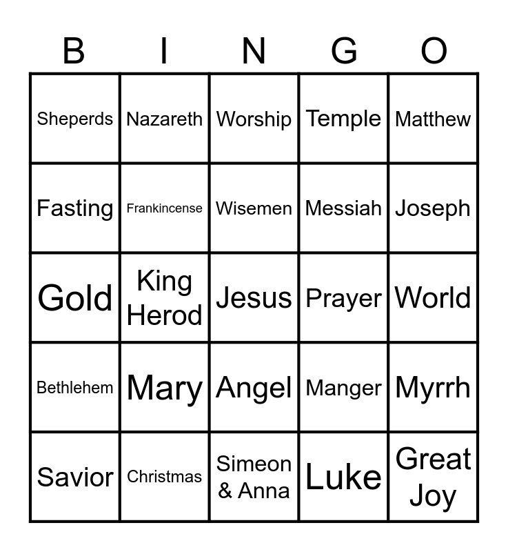 This bingo card has a free space and 24 words: Mary, Christmas, Wisemen, Savior, Matthew, Sheperds, Fasting, Nazareth, Prayer, Angel, Messiah, Gold, Manger, Myrrh, Frankincense, Luke, World, Worship, Joseph, King Herod, Great Joy, Bethlehem, Temple and Simeon & Anna.