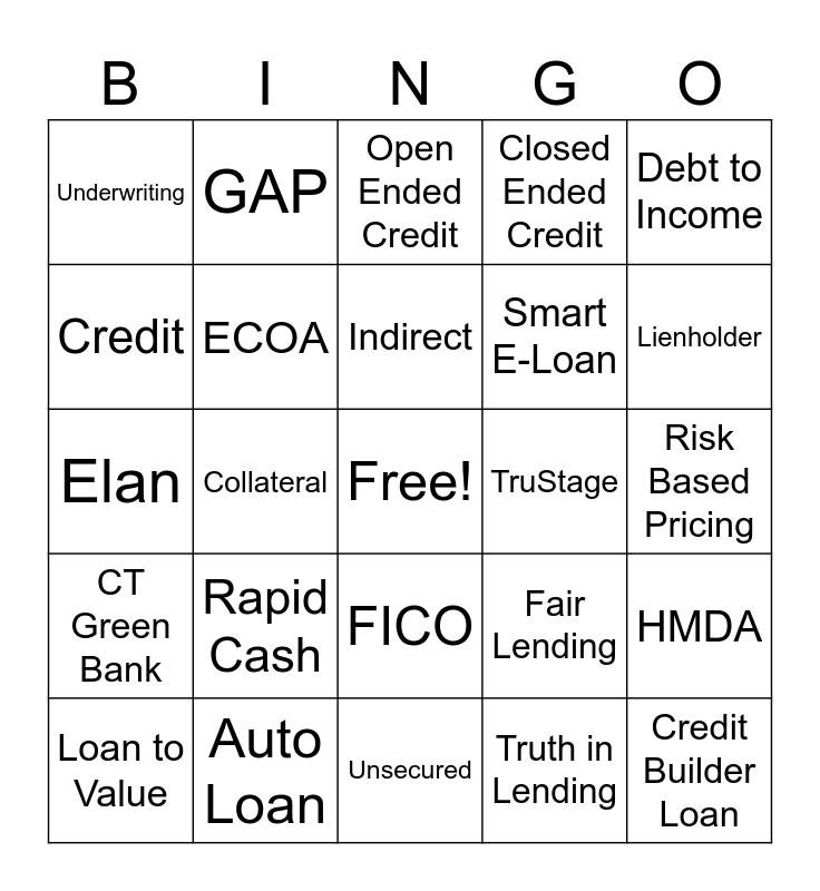 This bingo card has a free space and 24 words: Rapid Cash, Auto Loan, Indirect, Loan to Value, Debt to Income, Underwriting, Credit, GAP, TruStage, FICO, Smart E-Loan, Elan, Fair Lending, HMDA, ECOA, Truth in Lending, Risk Based Pricing, Open Ended Credit, Lienholder, Collateral, Credit Builder Loan, CT Green Bank, Closed Ended Credit and Unsecured.