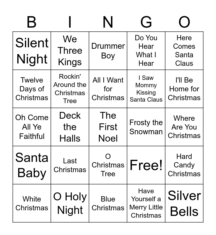 This bingo card has 25 words: Last Christmas, Blue Christmas, All I Want for Christmas, White Christmas, Here Comes Santa Claus, Silent Night, Twelve Days of Christmas, We Three Kings, Frosty the Snowman, O Christmas Tree, I Saw Mommy Kissing Santa Claus, Oh Come All Ye Faithful, Free!, Hard Candy Christmas, Rockin' Around the Christmas Tree, Silver Bells, Where Are You Christmas, Drummer Boy, I'll Be Home for Christmas, Deck the Halls, The First Noel, O Holy Night, Santa Baby, Do You Hear What I Hear and Have Yourself a Merry Little Christmas.