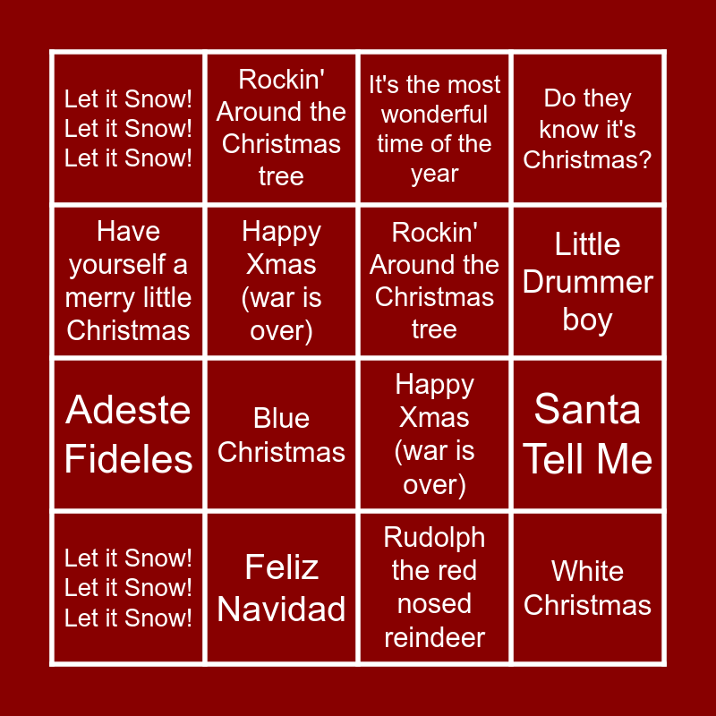 ⚠ This card has duplicate items: All I want for Christmas is you (2), Let it Snow! Let it Snow! Let it Snow! (2), Jingle bell rock (2), Rudolph the red nosed reindeer (2), Silent night (2), Last Christmas (2), It's the most wonderful time of the year (2), White Christmas (2), Have yourself a merry little Christmas (2), Frosty The Snowmen (2), Do they know it's Christmas? (2), Feliz Navidad (2), Santa Tell Me (2), Sowman (2), A nonsense Christmas (2), The first Noël (2), Little Drummer boy (2), Happy Xmas (war is over) (2), Adeste Fideles (2), Blue Christmas (2), Rockin' Around the Christmas tree (2), Underneath the tree (2)