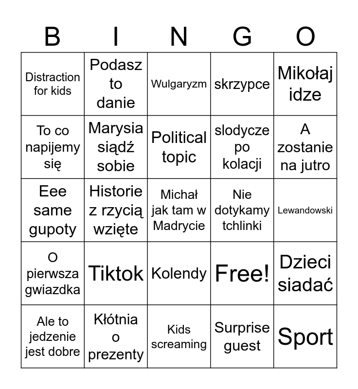 This bingo card has 25 words: Tiktok, Kids screaming, Political topic, Ale to jedzenie jest dobre, Mikołaj idze, Distraction for kids, To co napijemy się, Podasz to danie, Nie dotykamy tchlinki, Kolendy, slodycze po kolacji, Eee same gupoty, Free!, Dzieci siadać, Marysia siądź sobie, Sport, Lewandowski, Wulgaryzm, A zostanie na jutro, Historie z rzycią wzięte, Michał jak tam w Madrycie, Kłótnia o prezenty, O pierwsza gwiazdka, skrzypce and Surprise guest.