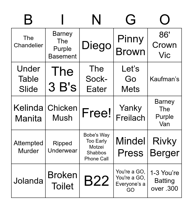 This bingo card has a free space and 24 words: Ripped Underwear, Broken Toilet, The Sock-Eater, Jolanda, 86' Crown Vic, The Chandelier, Under Table Slide, Barney The Purple Basement, Yanky Freilach, Bobe's Way Too Early Motzei Shabbos Phone Call, Let’s Go Mets, Kelinda Manita, Mindel Press, Rivky Berger, The 3 B's, You're a GO, You're a GO, Everyone’s a GO, Barney The Purple Van, Diego, Kaufman’s, Chicken Mush, 1-3 You’re Batting over .300, Attempted Murder, Pinny Brown and B22.