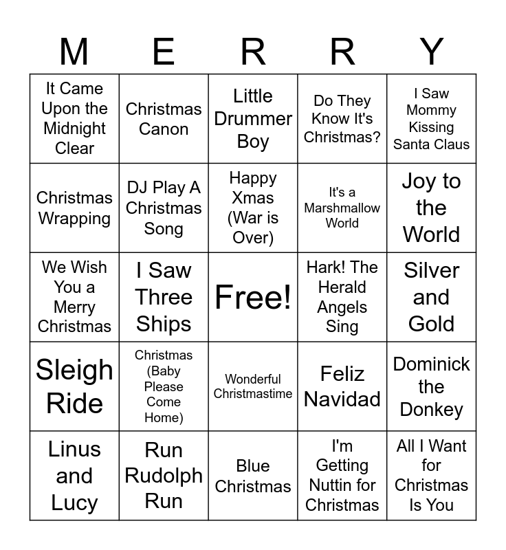 This bingo card has a free space and 51 words: A Holly Jolly Christmas, All I Want for Christmas Is You, Believe, Blue Christmas, Christmas (Baby Please Come Home), Christmas All Over Again, Christmas Canon, Christmas Eve / Sarajevo 12/24, Christmas Wrapping, Dance of the Sugar Plum Fairy, DJ Play A Christmas Song, Do They Know It's Christmas?, Dominick the Donkey, Feliz Navidad, Frosty the Snowman, God Bless Ye Merry Gentlemen, Happy Xmas (War is Over), Hark! The Herald Angels Sing, Home for the Holidays, I Saw Mommy Kissing Santa Claus, I Saw Three Ships, I'm Getting Nuttin for Christmas, It Came Upon the Midnight Clear, It's a Marshmallow World, Its Beginning to Look a Lot Like Christmas, Jingle Jingle Jingle, Joy to the World, Last Christmas, Linus and Lucy, Little Drummer Boy, Little Saint Nick, Mary, Did You Know?, Mele Kalikimaka, O Holy Night, Rockin' Around the Christmas Tree, Run Rudolph Run, Santa Baby, Santa Claus Is Comin' to Town, Santa Claus Is Coming To Town, Santa Tell Me, Silver and Gold, Sleigh Ride, Snoopy's Christmas, The Christmas Song, The First Noel, Underneath the Tree, We Wish You a Merry Christmas, White Christmas, Winter Wonderland, Wonderful Christmastime and You're a Mean One, Mr. Grinch.