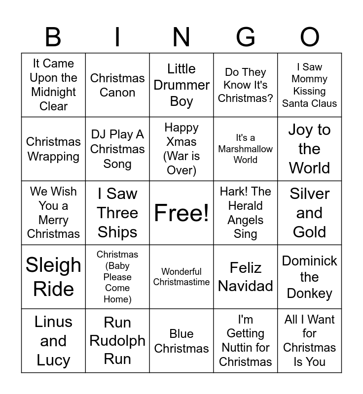 This bingo card has a free space and 51 words: A Holly Jolly Christmas, All I Want for Christmas Is You, Believe, Blue Christmas, Christmas (Baby Please Come Home), Christmas All Over Again, Christmas Canon, Christmas Eve / Sarajevo 12/24, Christmas Wrapping, Dance of the Sugar Plum Fairy, DJ Play A Christmas Song, Do They Know It's Christmas?, Dominick the Donkey, Feliz Navidad, Frosty the Snowman, God Bless Ye Merry Gentlemen, Happy Xmas (War is Over), Hark! The Herald Angels Sing, Home for the Holidays, I Saw Mommy Kissing Santa Claus, I Saw Three Ships, I'm Getting Nuttin for Christmas, It Came Upon the Midnight Clear, It's a Marshmallow World, Its Beginning to Look a Lot Like Christmas, Jingle Jingle Jingle, Joy to the World, Last Christmas, Linus and Lucy, Little Drummer Boy, Little Saint Nick, Mary, Did You Know?, Mele Kalikimaka, O Holy Night, Rockin' Around the Christmas Tree, Run Rudolph Run, Santa Baby, Santa Claus Is Comin' to Town, Santa Claus Is Coming To Town, Santa Tell Me, Silver and Gold, Sleigh Ride, Snoopy's Christmas, The Christmas Song, The First Noel, Underneath the Tree, We Wish You a Merry Christmas, White Christmas, Winter Wonderland, Wonderful Christmastime and You're a Mean One, Mr. Grinch.