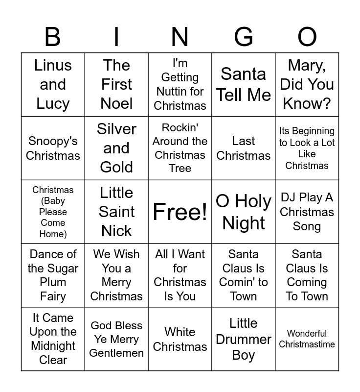 This bingo card has a free space and 51 words: You're a Mean One, Mr. Grinch, Wonderful Christmastime, Winter Wonderland, White Christmas, We Wish You a Merry Christmas, Underneath the Tree, The First Noel, The Christmas Song, Snoopy's Christmas, Sleigh Ride, Silver and Gold, Santa Tell Me, Santa Claus Is Coming To Town, Santa Claus Is Comin' to Town, Santa Baby, Run Rudolph Run, Rockin' Around the Christmas Tree, O Holy Night, Mele Kalikimaka, Mary, Did You Know?, Little Saint Nick, Little Drummer Boy, Linus and Lucy, Last Christmas, Joy to the World, Jingle Jingle Jingle, Its Beginning to Look a Lot Like Christmas, It's a Marshmallow World, It Came Upon the Midnight Clear, I'm Getting Nuttin for Christmas, I Saw Three Ships, I Saw Mommy Kissing Santa Claus, Home for the Holidays, Hark! The Herald Angels Sing, Happy Xmas (War is Over), God Bless Ye Merry Gentlemen, Frosty the Snowman, Feliz Navidad, Dominick the Donkey, Do They Know It's Christmas?, DJ Play A Christmas Song, Dance of the Sugar Plum Fairy, Christmas Wrapping, Christmas Eve / Sarajevo 12/24, Christmas Canon, Christmas All Over Again, Christmas (Baby Please Come Home), Blue Christmas, Believe, All I Want for Christmas Is You and A Holly Jolly Christmas.