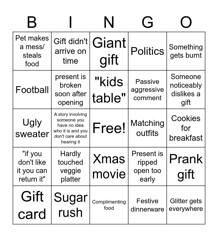 This bingo card has a free space and 24 words: Hardly touched veggie platter, Sugar rush, "kids table", Gift card, Something gets burnt, Pet makes a mess/ steals food, Football, Gift didn't arrive on time, Matching outfits, Xmas movie, Passive aggressive comment, Ugly sweater, Present is ripped open too early, Prank gift, present is broken soon after opening, Festive dinnerware, Cookies for breakfast, Giant gift, Someone noticeably dislikes a gift, A story involving someone you have no idea who it is and you don't care about hearing it, Glitter gets everywhere, "if you don't like it you can return it", Politics and Complimenting food.