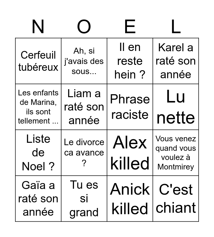 This bingo card has 16 words: Tu es si grand, Vous venez quand vous voulez à Montmirey, Il en reste hein ?, Cerfeuil tubéreux, Liste de Noel ?, Ah, si j'avais des sous..., Alex killed, Anick killed, Les enfants de Marina, ils sont tellement ..., Liam a raté son année, Gaïa a raté son année, Karel a raté son année, Le divorce ca avance ?, Lu nette, Phrase raciste and C'est chiant.