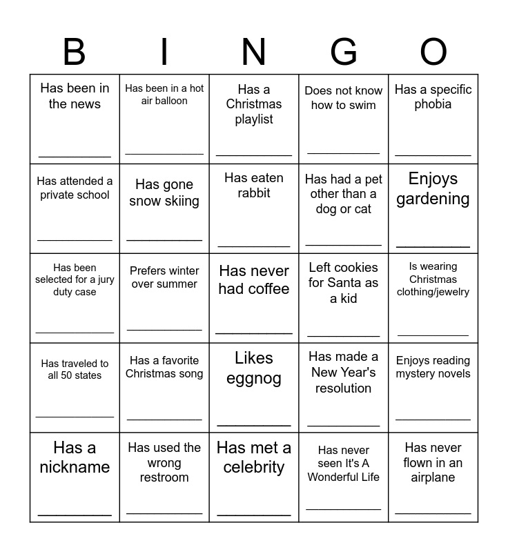 This bingo card has 31 words: Has met a celebrity ________, Has been to an NFL game ___________, Prefers winter over summer ____________, Has been on a game show ___________, Has been in the news __________, Has a Christmas playlist ___________, Has gone snow skiing __________, Has made a New Year's resolution __________, Left cookies for Santa as a kid __________, Has never seen It's A Wonderful Life ____________, Is wearing Christmas clothing/jewelry ____________, Has never had coffee _________, Has never flown in an airplane ___________, Has traveled by train instead of car _____________, Enjoys gardening ________, Favorite color is green ___________, Enjoys reading mystery novels ____________, Has a favorite Christmas song ____________, Has traveled to all 50 states ______________, Likes eggnog ________, Has a specific phobia ___________, Has won a contest ________, Has a nickname ________, Has been in a hot air balloon ______________, Has had a pet other than a dog or cat ___________, Has attended a private school ____________, Does not know how to swim ___________, Has been selected for a jury duty case ______________, Has used the wrong restroom ___________, Has eaten rabbit __________ and Has slept in a vehicle overnight __________.