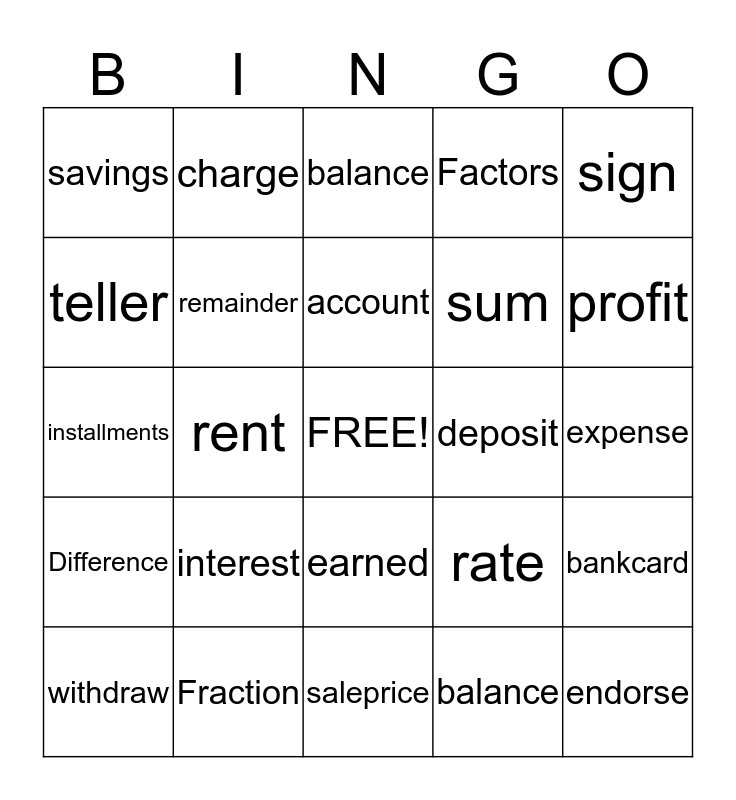 This bingo card has a free space and 62 words: Quotient, Fraction, Denominator, Difference, sets, numerator, remainder, product, sum, Divisor, Factors, check, teller, bank, recorded, savings, endorse, sign, passbook, account, deposit, balance, withdraw, balance, overdrawn, service, statement, minimum, bankcard, overdraft, checkbook, budget, mortgage, income, expense, charge, household, debt, rent, credit, installments, percent, interest, calculate, profit, rate, monthly, daily, penalty, annual, earned, saleprice, discount, reduction, share, stockbroker, closing price, invest, value, company, stock and loss.