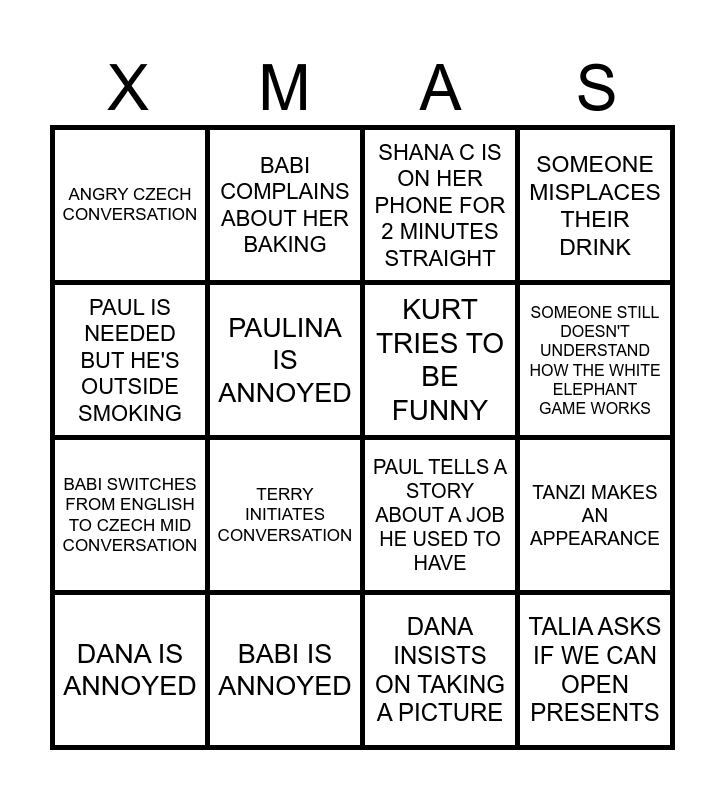 This bingo card has 24 words: DANIKA HAS RBF (PHOTO PROOF REQUIRED), UM, SOMEONE STILL DOESN'T UNDERSTAND HOW THE WHITE ELEPHANT GAME WORKS, DANA COMPLAINS SHE'S "NOT READY", PAUL IS NEEDED BUT HE'S OUTSIDE SMOKING, ANGRY CZECH CONVERSATION, PAULINA IS ANNOYED, BABI COMPLAINS ABOUT HER BAKING, BABI IS ANNOYED, BABI SHOWS SOMEONE A VIDEO/PICTURE ON HER CELL PHONE, BABI SWITCHES FROM ENGLISH TO CZECH MID CONVERSATION, PAUL TELLS A STORY ABOUT A JOB HE USED TO HAVE, SOMEONE COMPLAINS ABOUT BEING TOO FULL, DASH JUMPS ON YOUR LAP (UNINVITED), KURT TRIES TO BE FUNNY, SOMEONE MISPLACES THEIR READING GLASSES, DANA INSISTS ON TAKING A PICTURE, SHANA C IS ON HER PHONE FOR 2 MINUTES STRAIGHT, TERRY INITIATES CONVERSATION, TANZI MAKES AN APPEARANCE, DANA IS ANNOYED, TALIA ASKS IF WE CAN OPEN PRESENTS, SOMEONE MISPLACES THEIR DRINK and AWKWARD SILENCE.