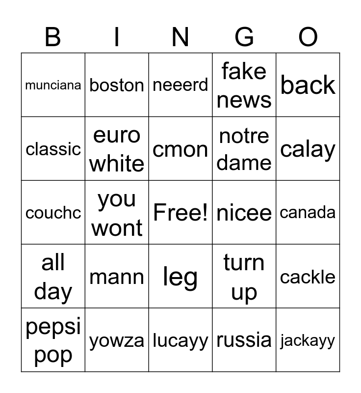This bingo card has a free space and 24 words: mann, yowza, cmon, pepsi pop, back, munciana, classic, boston, nicee, leg, notre dame, couchc, turn up, cackle, euro white, russia, canada, neeerd, calay, you wont, jackayy, all day, fake news and lucayy.