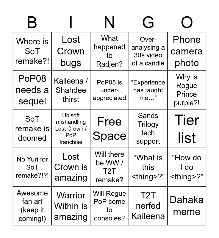 This bingo card has a free space and 24 words: Lost Crown is amazing, Warrior Within is amazing, PoP08 is under-appreciated, Awesome fan art (keep it coming!), Phone camera photo, Where is SoT remake?!, PoP08 needs a sequel, Lost Crown bugs, Sands Trilogy tech support, Will there be WW / T2T remake?, “Experience has taught me…”, SoT remake is doomed, “What is this <thing>?”, “How do I do <thing>?”, Kaileena / Shahdee thirst, T2T nerfed Kaileena, Tier list, What happened to Radjen?, Why is Rogue Prince purple?!, Ubisoft mishandling Lost Crown / PoP franchise, Dahaka meme, No Yuri for SoT remake?!?!, Over-analysing a 30s video of a candle and Will Rogue PoP come to consoles?.