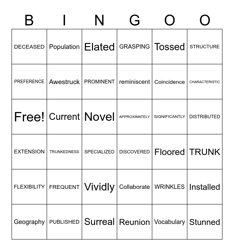 This bingo card has 36 words: Collaborate, Vividly, Reunion, PREFERENCE, EXTENSION, APPROXIMATELY, Awestruck, Surreal, Tossed, WRINKLES, CHARACTERISTIC, GRASPING, Installed, Current, reminiscent, DECEASED, FLEXIBILITY, SIGNIFICANTLY, Free!, Elated, Novel, TRUNKEDNESS, DISCOVERED, SPECIALIZED, Floored, Population, Coincidence, PUBLISHED, PROMINENT, STRUCTURE, Stunned, Geography, TRUNK, DISTRIBUTED, FREQUENT and Vocabulary.