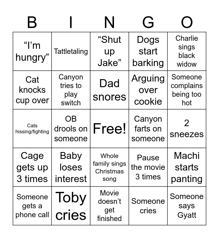 This bingo card has a free space and 24 words: Baby loses interest, Toby cries, Dad snores, Someone gets a phone call, Charlie sings black widow, “I’m hungry”, Cat knocks cup over, Tattletaling, Canyon farts on someone, Whole family sings Christmas song, Arguing over cookie, Cats hissing/fighting, Pause the movie 3 times, Machi starts panting, Canyon tries to play switch, Someone cries, 2 sneezes, “Shut up Jake”, Someone complains being too hot, OB drools on someone, Someone says Gyatt, Cage gets up 3 times, Dogs start barking and Movie doesn’t get finished.
