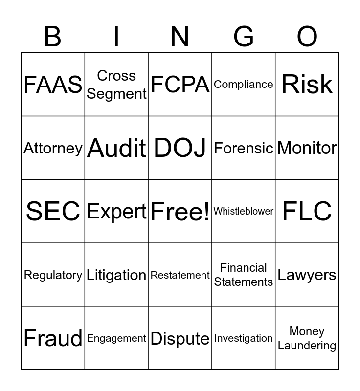 This bingo card has a free space and 24 words: Litigation, Engagement, DOJ, Fraud, Risk, FAAS, Attorney, Cross Segment, Whistleblower, Restatement, Forensic, SEC, Financial Statements, Lawyers, Audit, Investigation, FLC, FCPA, Monitor, Expert, Money Laundering, Regulatory, Compliance and Dispute.