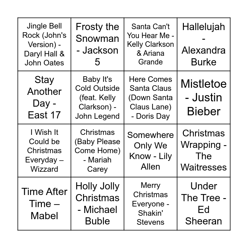 This bingo card has 100 words: Last Christmas - Wham!, All I want for Christmas is you - Mariah Carey, Merry Christmas Everyone - Shakin' Stevens, Rocking' Around the Christmas Tree - Brenda Lee, Step into Christmas - Elton John, Underneath the Tree - Kelly Clarkson, Fairytale of New York (feat. Kirsty MacColl) - The Pogues, It's the Most Wonderful Time of the Year - Andy Williams, Jingle Bell Rock - Bobby Helms, Do They Know It's Christmas - Band Aid, One More Sleep - Leona Lewis, It's Beginning to Look a Lot like Christmas - Michael Buble, Merry Xmas Everybody – Slade, Santa Tell Me - Ariana Grande, Driving Home for Christmas - Chris Rea, Merry Christmas - Ed Sheeran & Elton John, I Wish It Could be Christmas Everyday – Wizzard, Happy Xmas (War is Over) - John Lennon & Yoko Ono, Wonderful Christmastime - Paul McCartney, Sleigh Ride - The Ronettes, Let it Snow! Let it Snow! Let it Snow! - Dean Martin, Feliz Navidad - Jose Feliciano, Christmas (Baby Please Come Home) - Darlene Love, DJ Play A Christmas Song – Cher, Stop the Cavalry - Jona Lewie, Holly Jolly Christmas - Michael Buble, Stay Another Day - East 17, Santa Claus is Coming To Town - Jackson 5, All Alone on Christmas - Darlene Love, Winter Wonderland - Bing Crosby, Christmas Wrapping - The Waitresses, Jingle Bell Rock (John's Version) - Daryl Hall & John Oates, It's Beginning to Look a Lot Like Christmas - Perry Como & The Fontane Sisters, What Christmas Means To Me - Stevie Wonder, Run Rudolph Run - Chuck Berry, Mistletoe - Justin Bieber, Jingle Bells (feat. The Puppini Sisters) - Michael Buble, Snowman – Sia, Mary's Boy Child/Oh My Lord - Boney M., Cozy Little Christmas - Katy Perry, Christmas Lights – Coldplay, Lonely This Christmas – Mud, Somewhere Only We Know - Lily Allen, Christmas Time (Don't Let the Bells End) - The Darkness, Christmas (Baby Please Come Home) - Mariah Carey, Santa Can't You Hear Me - Kelly Clarkson & Ariana Grande, Little Saint Nick - The Beach Boys, Santa Baby - Eartha Kits, Let it Snow! - Michael Buble, A Spaceman Came Travelling - Chris de Burgh, Santa Claus is Comin' to Town - Frank Sinatra, The Christmas Song (Merry Christmas to You) - Nat "King" Cole, My Only Wish (This Year) - Britney Spears, 2000 Miles – Pretenders, White Christmas - Bing Crosby, Christmas Magic – Perrie, Rockin' Around The Christmas Tree (feat. Grace VanderWaal) - Ingrid Michaelson, Santa Baby - Kylie Minogue, Let It Snow! Let It Snow! - Frank Sinatra, Hallelujah - Alexandra Burke, Carol of the Bells - John Williams, Thank God It's Christmas – Queen, White Christmas - Michael Buble, Rudolph the Red Nosed Reindeer - Dean Martin, This Christmas - Donny Hathaway, Santa Claus Is Comin' to Town (Live) - Bruce Springsteen, I Believe in Father Christmas – Emerson Lake & Palmer, Frosty the Snowman - The Ronettes, Rudolph the Red Nosed Reindeer - The Crystals, Have Yourself a Merry Little Christmas - Frank Sinatra, The Power of Love - Frankie Goes to Hollywood, When a Child Is Born - Johnny Mathis, A Holly Jolly Christmas - Burl Ives, Like It's Christmas - Jona Brothers, Baby It's Cold Outside (feat. Louis Jordan & His Tympany Five) - Ella Fitzgerald, Happy Holiday/The Holiday Season - Andy Williams, You Make It Feel Christmas (feat. Blake Shelton) - Gwen Stefani, Baby It's Cold Outside (feat. Kelly Clarkson) - John Legend, Deck the Hall - Nat "King" Cole, Blue Christmas - Elvis Presley & Martina McBride, buy me presents - Sabrina Carpenter, Time After Time – Mabel, A Holly Jolly Christmas - Lady A, Winter Wonderland - Aretha Franklin, 1 Wish - Ava Max, Frosty the Snowman - Jackson 5, Here Comes Santa Claus (Right Down Santa Claus Lane) - Gene Autry, Jingle Bell Rock - The Vamps, Mistletoe & Wine - Cliff Richard, Under The Tree - Ed Sheeran, I Saw Mommy Kissing Santa Claus - The Ronettes, Silver Bells (feat. Naturally 7) - Michael Buble, Peace On Earth/The Little Drummer Boy - Bing Crosby, David Bowie & London Symphony Orchestra, Jingle Bells - Frank Sinatra, Here Comes Santa Claus (Down Santa Claus Lane) - Doris Day, You're a Mean One Mr. Grinch - Thurl Ravenscroft, You're Christmas To Me - Sam Ryder, O Holy Night - Celine Dion, Please Come Home for Christmas – Eagles and Have Yourself A Merry Little Christmas - Judy Garland.
