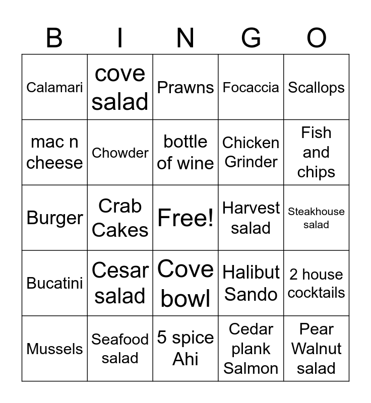 This bingo card has a free space and 29 words: Mussels, Seafood Fondue, Crab Cakes, Meatballs, Calamari, Prawns, Chowder, Cesar salad, Harvest salad, Seafood salad, Steakhouse salad, Pear Walnut salad, 5 spice Ahi, Cedar plank Salmon, Fish and chips, Parmesan Halibut, Cove bowl, Bucatini, Scallops, Burger, Halibut Sando, Short rib Sando, Chicken Grinder, mac n cheese, Focaccia, cove salad, 2 house cocktails, bottle of wine and Dessert.