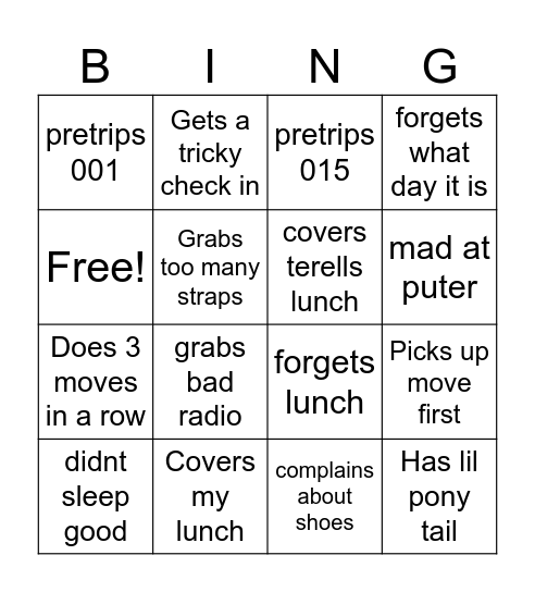 This bingo card has 16 words: Covers my lunch, Picks up move first, pretrips 015, pretrips 001, Does 3 moves in a row, Gets a tricky check in, forgets lunch, complains about shoes, Free!, Grabs too many straps, didnt sleep good, forgets what day it is, grabs bad radio, mad at puter, covers terells lunch and Has lil pony tail.