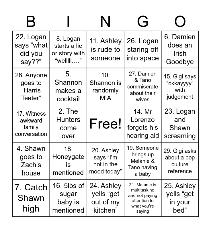 This bingo card has a free space and 33 words: Family Bingo Card, 1. Gigi tells the same story twice, 2. The Hunters come over, 3. Logan asks to play a video game, 4. Shawn goes to Zach’s house, 5. Shannon makes a cocktail, 6. Damien does an Irish Goodbye, 7. Catch Shawn high, 8. Logan starts a lie or story with “welllll….”, 9. Logan corrects a bad word that’s not really a bad word, 10. Shannon is randomly MIA, 11. Ashley is rude to someone, 12. Ashley cries, 13. Someone (under 50) calls Elizabeth by her first name, 14. Mr Lorenzo forgets his hearing aid, 15. Gigi says “okkayyyy” with judgement, 16. 5lbs of sugar baby is mentioned, 17. Witness awkward family conversation, 18. Honeygate is mentioned, 19. Someone brings up Melanie & Tano having a baby, 20. Ashley says “I’m not in the mood today”, 21. Melanie asks the baby’s name, 22. Logan says “what did you say??”, 23. Logan and Shawn screaming, 24. Ashley yells “get out of my kitchen”, 25. Ashley yells “get in your bed”, 26. Logan staring off into space, 27. Damien & Tano commiserate about their wives, 28. Anyone goes to “Harris Teeter”, 29. Gigi asks about a pop culture reference, 30. Logan asks for a snack, 31. Melanie is multitasking and not paying attention to what you’re saying and 32. You receive a text from someone in the same room as you.